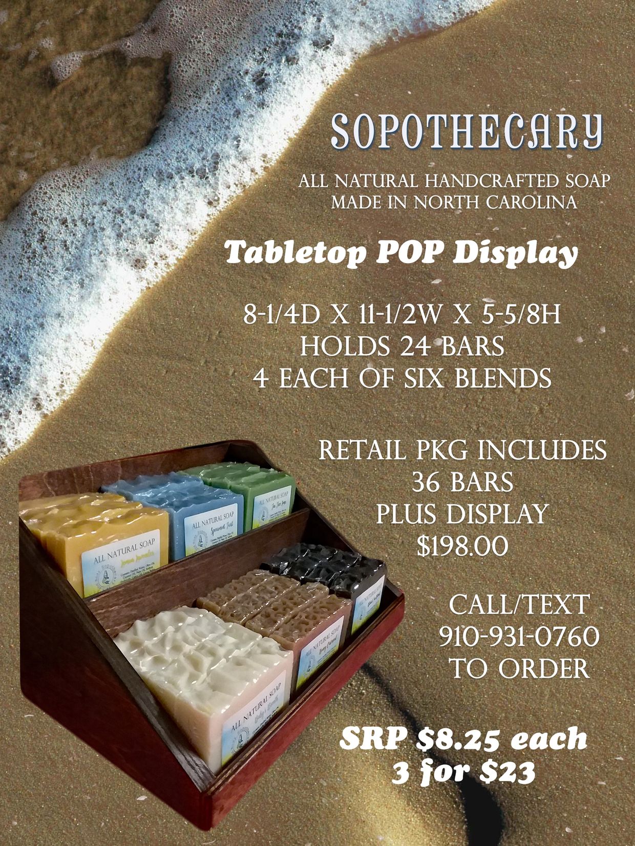 Small footprint is perfect for limited space or last minute purchases at register. Soap selection can be ordered from any of the blends we currently make, custom blends are available (6 weeks out).